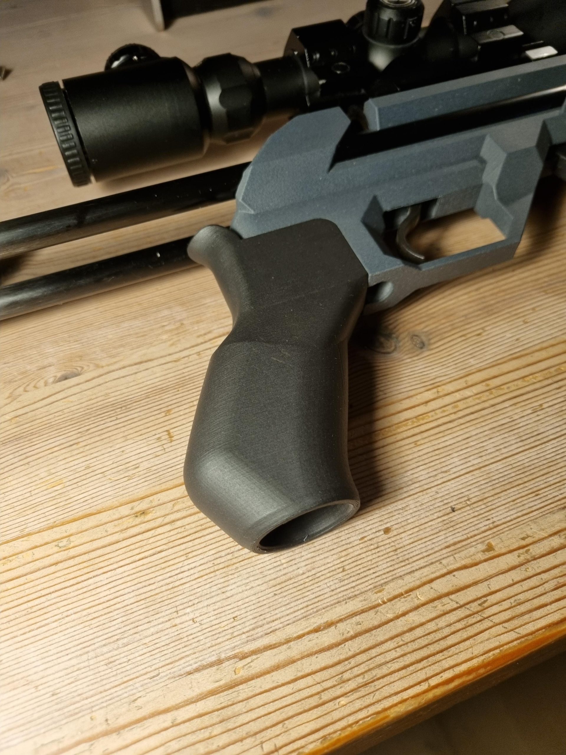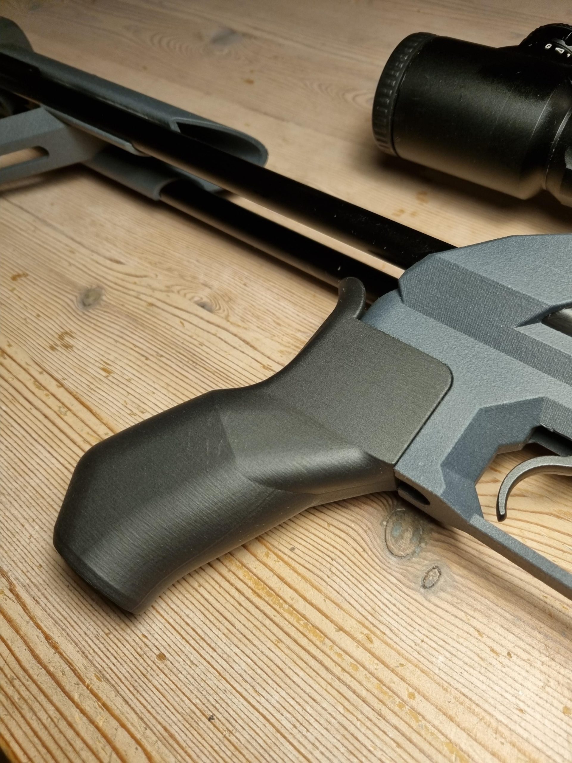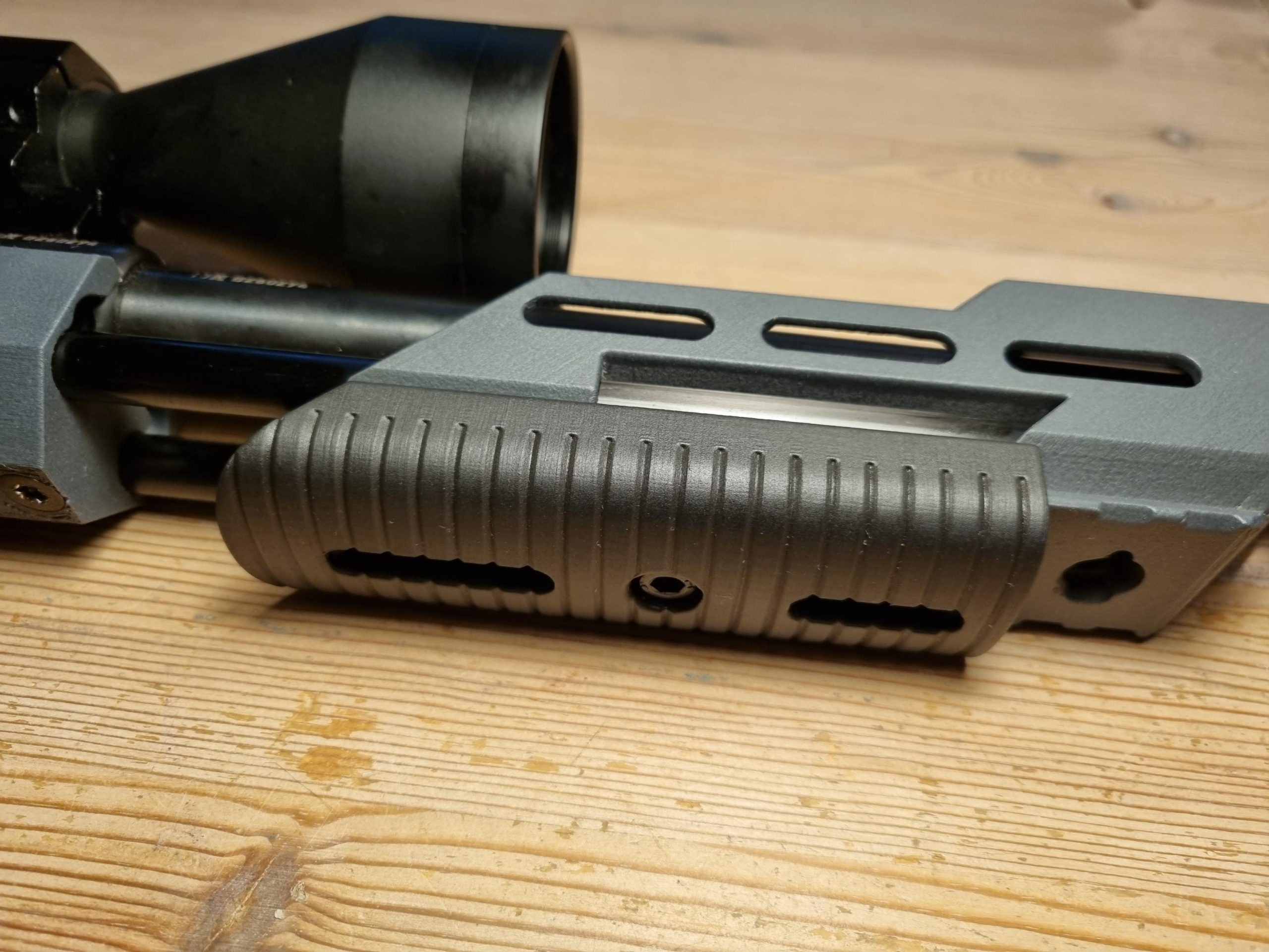 Apart from several grips, he have also made a handguard, and an instert solution to attach the buttstock with screws.
