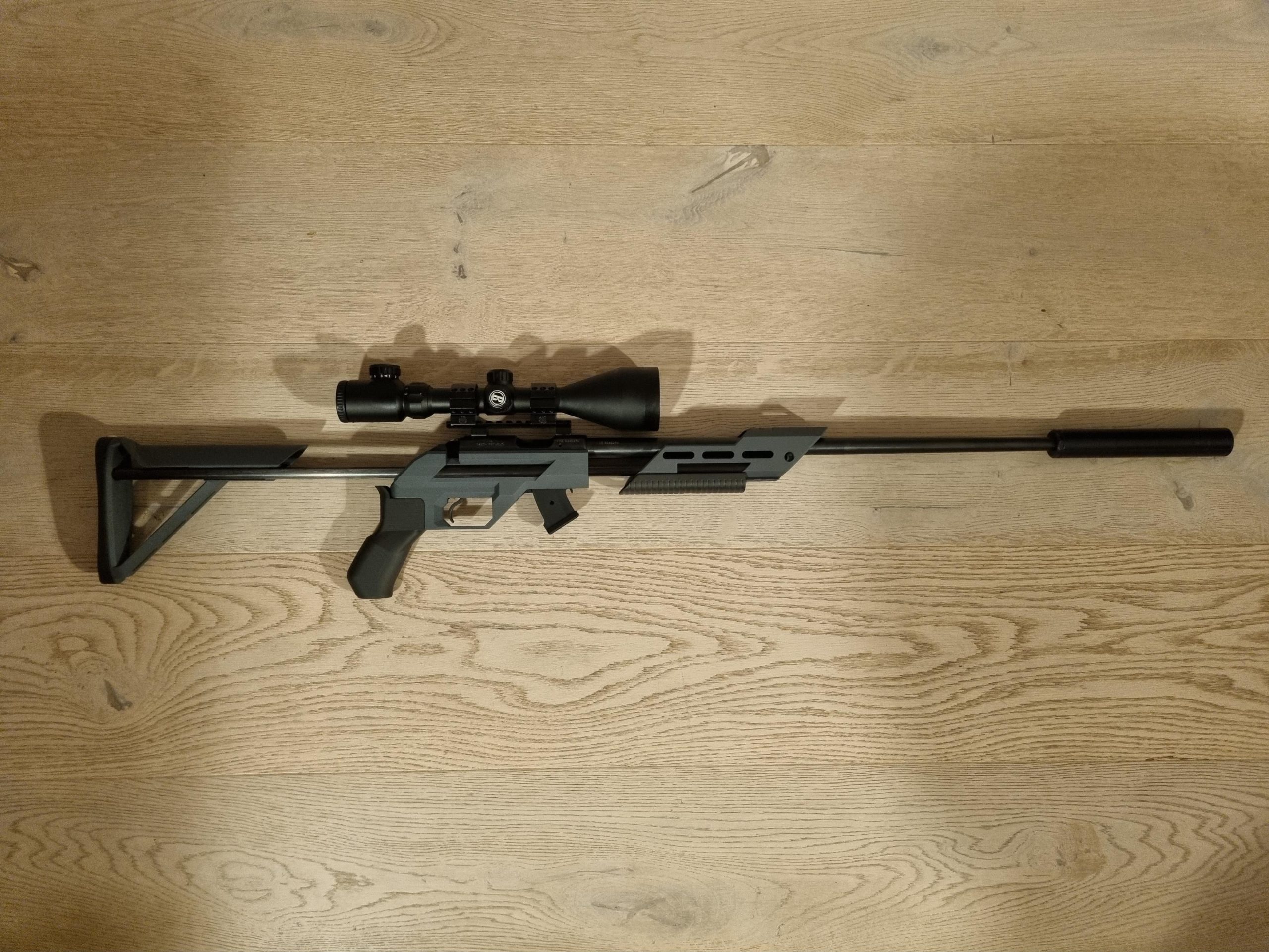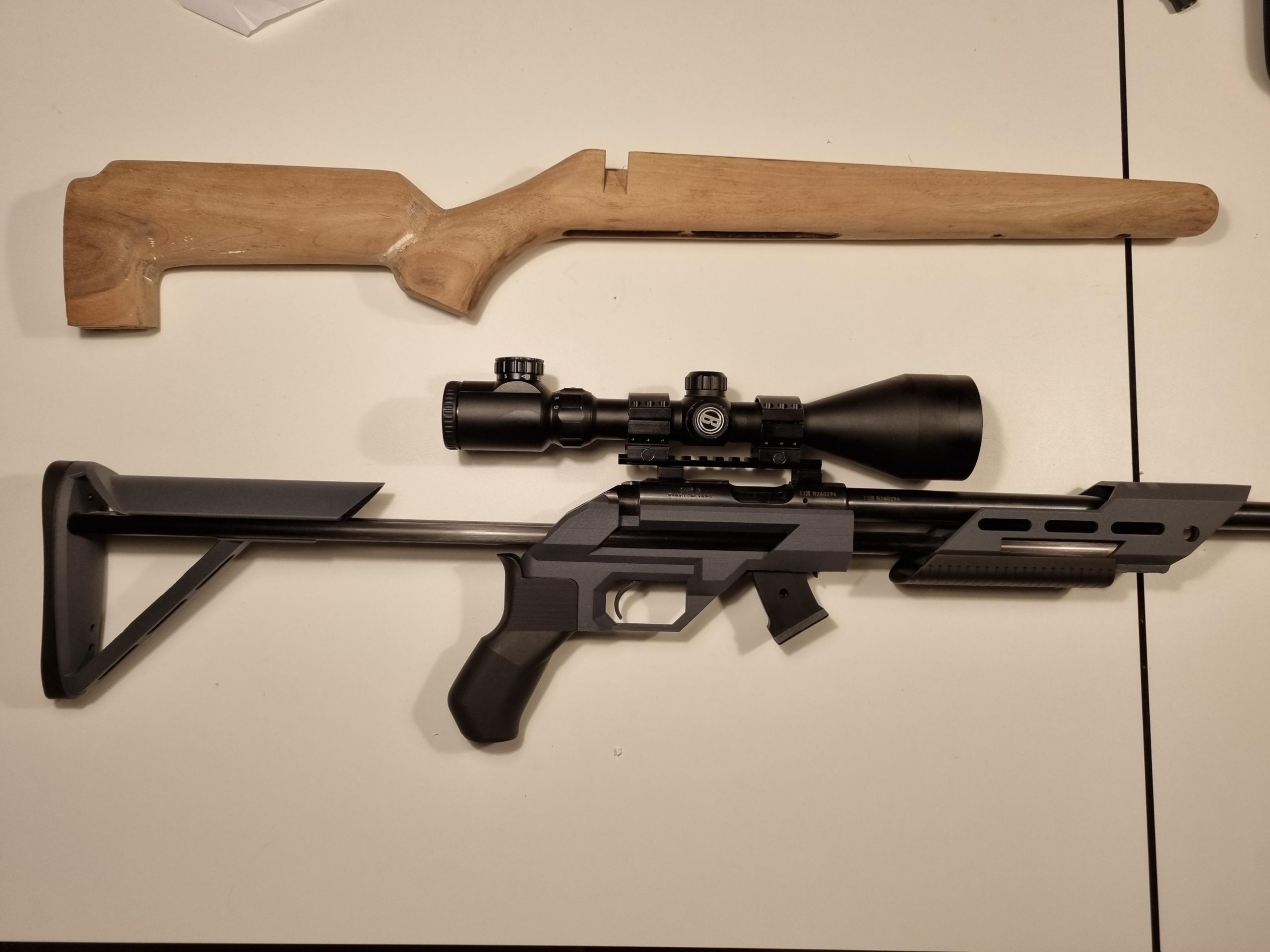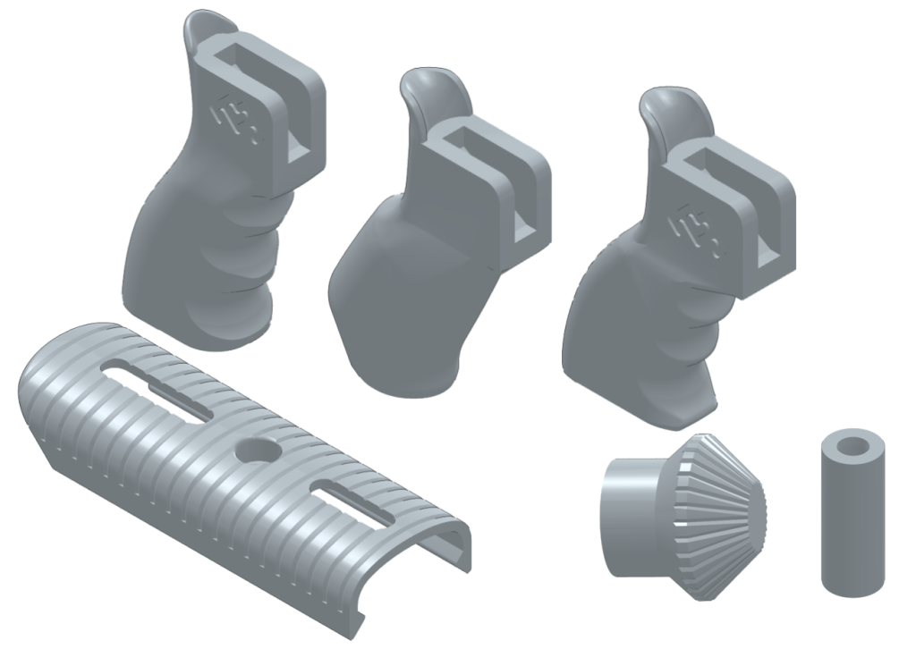 Apart from several grips, he have also made a handguard, and an instert solution to attach the buttstock with screws.